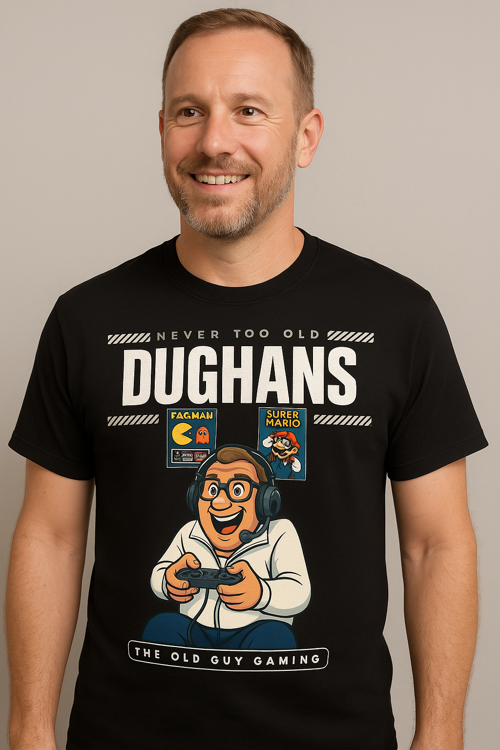 Level up your wardrobe with the 'Dughans: The Old Guy Gaming' tee – a humorous and nostalgic design for old-school gamers who still play like pros.